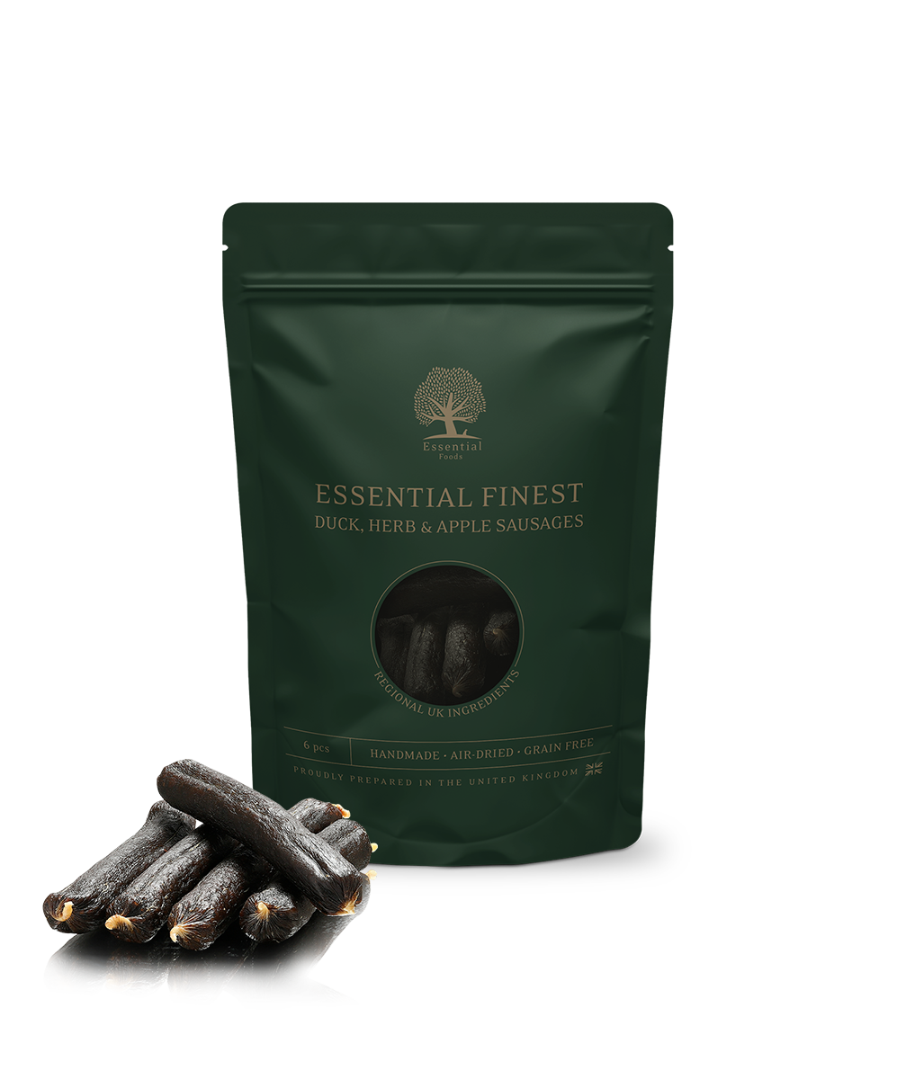 When only the BEST is good enough. ESSENTIALS FINEST is our range of luxury treats using only the best ingredients like our meals. These are 6 bigger sized snack sausages made with duck, herbs and apples - a superb combination so tempting that even you would like a piece! Air-dried and 100% made in England.